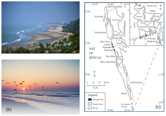 (a) Cox’s Bazar Sea beach [67]; (b) Sun set at Cox’s Bazar Sea beach [68]; (c) Data collection or sample site in Cox’s Bazar Sea beach [69].