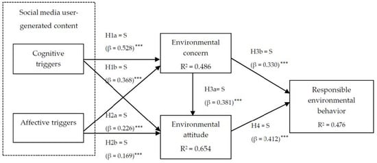 The indirect impact assessment allows further assessments of the mediating role between variables within the proposed model. The roles of the environmental concern, environmental attitude as mediators between cognitive triggers, affective triggers, and responsible environmental behavior were examined via the bootstrapping method (see Table 5). Travelers environmental concerns and environmental attitudes significantly mediated the impact of UGC cognitive triggers on responsible environmental behavior [0.201 ***; p < 0.001; 95% confidence interval (CI)]. Additionally, environmental concerns significantly mediated the impact of UGC cognitive triggers on responsible environmental behavior [0.174 ***; p < 0.001; 95% confidence interval (CI)]. Finally, environmental attitudes significantly mediated the impact of UGC cognitive triggers on responsible environmental behavior [0.152 ***; p < 0.001; 95% confidence interval (CI)].