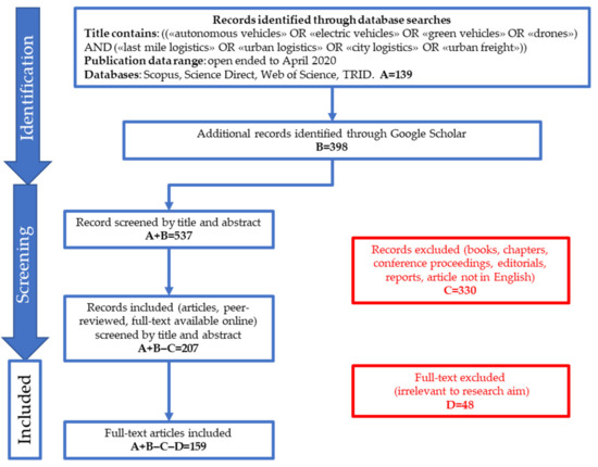 The literature selection procedure is shown in Figure 1. The keywords selected in the initial thematic search were: ‘autonomous vehicles’, ‘electric vehicles’, ‘green vehicles’, ‘last mile logistics’, ‘urban logistics’, ‘city logistics’, and ‘urban freight’. The query string used for database searches was: ((«autonomous vehicles» OR «electric vehicles» OR «green vehicles» OR «drones») AND («last mile logistics» OR «urban logistics» OR «city logistics» OR «urban freight»)).