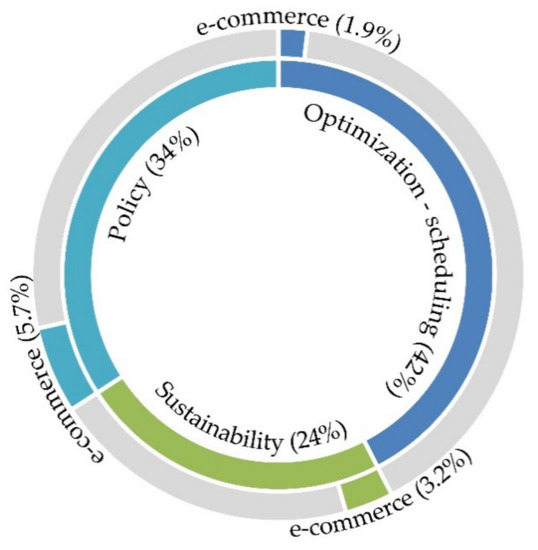 Some review articles [18,19,20,21], employing a multidisciplinary approach, investigated aspects belonging to different categories (e.g., policy and sustainability). In these few cases the papers were classified following the topic that was considered characteristic and prevailing. Finally, the works about e-commerce were simply retrieved verifying that the topic was adequately dealt with in the text.