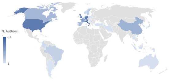 Table A1, Table A2 and Table A3 in the Appendix A summarize the classification of the main contributions of the relevant papers included in this review sorted by the number of citations; a similar approach has been already proposed by Hilmola [22]. Figure 2 plots the publication year of the works selected. It can be noted that most of the works are quite recent and belong to the 2010–2020 decade. Figure 3 shows the distribution of the works per category: 42% belongs to the optimization and scheduling group (O), 34% is related to policy (P), and 24% is sustainability centered (S). The total percentage of papers containing references to e-commerce is 11% with 5.7% belonging to the policy group (see Figure 3). Figure 4 shows a word map colored for the number of authors per country: As can be expected, the most of them are affiliated with research institutions settled in developed countries (e.g., Europe and North America). Table 1 shows the most active authors with more than three papers in the sample analyzed.