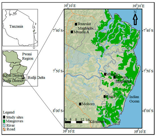 The Rufiji Delta lies within the Kibiti and Rufiji Districts of the Pwani Region in Tanzania (7°40′–8°00′ S, 39°10–20′ E; Figure 1). The delta holds the largest mangrove ecosystem in Tanzania and is covered by almost 45,519 ha of mangrove forests [27]. The delta is well settled with several villages that are located outside and within the mangrove forests [26]. On the basis of disparity in proximity to mangrove forests, as well as on social systems (transport and energy accessibility, livelihood options, and sociodemographic status), we selected six villages spread across the delta for this field survey, namely, Mohoro, Mtunda A, Ruaruke Magharibi, Ruma, Mbwera Magharibi, and Mbuchi. The first 3 stated villages are situated at a relatively large distance (>1 km) from any edge of mangrove forests (DM); accessible by roads; electrified; and dominated by livelihoods from farming, small business-like food vending, and exploitation of both inland and mangrove forests. The other villages (Ruma, Mbwera Magharibi, and Mbuchi) are located in close proximity to mangrove forests (CM); often only accessible by boat through river channels, and sometimes by roads, especially during the dry season; non-electrified; and are mainly characterized by livelihood opportunities, which include farming, fishing, and heavy utilization of mangrove resources, such as poles and firewood. Farming activities in the delta are highly dependent on the rainfall and overflow frequency from the Rufiji River [4]. The delta exhibits a bimodal rainfall pattern, which occurs from February to May as long rains, and from October to December as short rains [28]. According to the village census of 2018, the Mohoro village has a population of 5119 people, which is larger compared to Mtunda A (3583), Ruaruke Magharibi (3371), Ruma (2336), Mbwera Magharibi (3467), and Mbuchi (2978) (Village leaders, personal communication, 2018).