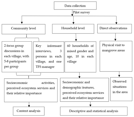 A research design of both qualitative and quantitative nature [29] was used in this study. The field work was carried out from February to April, 2018, at both community and household levels, to explore how local communities in the Rufiji Delta perceive a multitude of ecosystem services provided by mangroves and factors influencing on their perceptions. Data were collected through focus group discussions (FGDs), key informant interviews (KIIs), household questionnaire survey (HHQ), and field observations. A mixture of these methods was used to cross check and validate the collected information. Prior to the data collection, respondents were informed about the purpose of the study and requested for their consent to participate. The respondents were purposively selected by the assistance from village leaders, and only those that to some extent interacted with mangroves were involved, because they were believed to have good knowledge and information about mangrove ecosystems. The overall methodological scheme is illustrated in Figure 2.