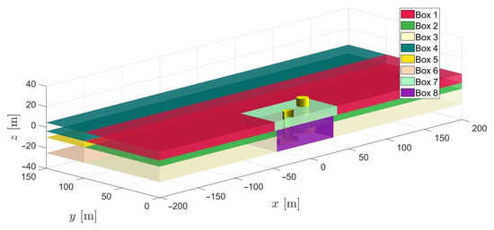 Refinement boxes 1 through 6 improve the mesh resolution near and right below the free surface. They cover the full extent of the numerical domain in the -direction, except for the downstream wave-damping zone, where the mesh was suitably coarsened. Boxes 1 through 3 cover the inner (in the -direction) section of the domain containing the floater, whereas boxes 4 through 6 cover the outer flank of the domain with doubled to reduce the number of cells. Near the free surface, we have and . Both longitudinal and vertical mesh resolutions exceed what would typically be used in regular-wave simulations (see, e.g., [34]). Note that the cell dimensions do not change with in boxes 1 through 6 to avoid any spurious wave reflection caused by an abrupt change in mesh resolution. Refinement boxes 7 and 8 cover the space near the wetted portion of the floater. The values of and on the free surface near the floater (Box 7) are kept consistent with those in the rest of the domain (Box 1) to ensure uninterrupted wave propagation; however, is reduced in Box 7 to be equal to to better resolve the diffracted waves near the floater. Box 8 refines the mesh near the submerged portion of the floater with isotropic cell sizes to better resolve flow separation from the heave plates. The surface mesh of the floater consists of square patches approximately wide. A prism mesh zone extruded from the floater surface helps better resolve the viscous boundary layer. The total thickness of the prism mesh is 0.4 m divided into 10 layers with a constant expansion ratio and a first layer thickness of 1 mm. Note that because we did not use any turbulence model or wall function, it is likely that the boundary-layer behavior was not fully captured. Because of the low KC number of the present problem, however, viscous effects primarily manifested as flow separation from the sharp corners of the heave plates, which is insensitive to the structure of the boundary layer; therefore, we still expect to obtain reasonable results with the present setup. Outside the refinement zones, the cell size gradually expands to 32 in all three directions in the far field. Overall, the baseline grid consists of 6 million cells for a half domain.