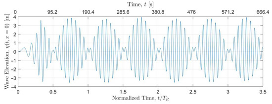 As an example, the time series of at is shown in Figure 5. The initial transient phase can be observed during the first half of the first repeat period. During the last two repeat periods, , becomes approximately periodic; therefore, using a fast Fourier transform (FFT), we can extract the complex wave amplitudes, and , at the two wave frequencies, and , as well as the wave amplitude, , at the difference frequency, , from the time series of over the time window . This was done for each -position where the wave elevation was recorded, and the results are shown in Figure 6. Overall, the wave-frequency amplitudes remain relatively constant during the entire length of the numerical domain—except in the downstream wave damping zone, where a rapid decrease can be observed. The amplitude of the higher frequency wave component, , shows only slight wave dissipation downstream, which is likely caused by minor numerical diffusion.