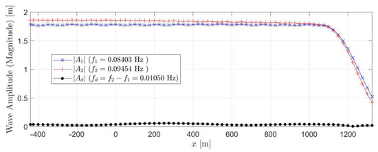 Variation of wave amplitudes (magnitude) at the two wave frequencies, and , and the difference frequency, , over the length of the numerical domain.