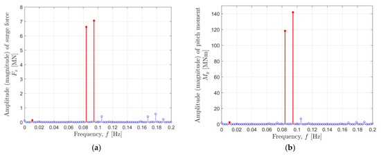 Amplitude (magnitude) spectra of (a) wave-exciting force in surge, , and (b) moment in pitch, , computed from the time window The difference-frequency component at and the two wave-frequency components at and are highlighted in red with a filled symbol.