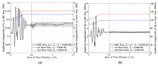 Further, the amplitudes of the wave excitation (the frequency components highlighted in red in Figure 8) fluctuate slightly depending on the time window used for the FFT analysis. This fluctuation obtained using a sliding-window analysis is illustrated in Figure 9, which shows the wave-excitation amplitudes at the difference frequency and the two wave frequencies as functions of the start of the time window, , normalized by the repeat period, . The FFT time window is long, covering the interval . Strong transient effects can be observed for . For , the fluctuation becomes negligible at the two wave frequencies, indicating that periodic steady state has been reached. The nonlinear wave excitation at the difference frequency still shows some fluctuation. This fluctuation can be quantified using the standard deviations, , of the wave-load amplitudes from to . The grey bands in Figure 9 show the (95% confidence) intervals about the means. To minimize the initial transient effect, the wave-load amplitudes computed from the last time window, , are taken as the final results.