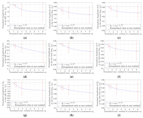 Estimation of iterative errors and uncertainties in the normalized wave-load amplitudes (magnitude). The red crosses correspond to the results from different convergence runs, and the red uncertainty bands represent the estimated iterative uncertainty. The fitted error estimators are included as blue lines. The top (a–c), middle (d–f), and bottom (g–i) rows correspond to the amplitudes of surge force, heave force, and pitch moment, respectively. The left (a,d,g), center (b,e,h), and right (c,f,i) columns correspond to the difference frequency, first wave frequency, and second wave frequency, respectively. The residual is normalized by that of the baseline solution with 40 iterations per time step.
