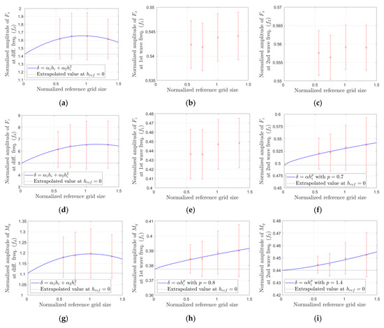 Estimation of spatial discretization errors and uncertainties in the normalized wave-load amplitudes (magnitude). The red crosses correspond to results from different convergence runs, and the red uncertainty bands represent the estimated spatial-discretization uncertainty. The fitted error estimators, when available, are included as blue lines. If no error estimator is shown, the range-based uncertainty estimate was used. The top (a–c), middle (d–f), and bottom (g–i) rows correspond to the amplitudes of surge force, heave force, and pitch moment, respectively. The left (a,d,g), center (b,e,h), and right (c,f,i) columns correspond to the difference frequency, first wave frequency, and second wave frequency, respectively. The reference cell size is normalized by the baseline value of .