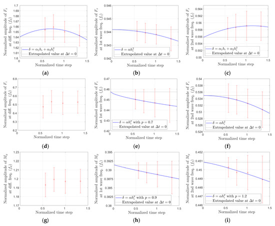 Estimation of temporal discretization errors and uncertainties in the normalized wave-load amplitudes (magnitude). The red crosses correspond to results from different convergence runs, and the red uncertainty bands represent the estimated temporal-discretization uncertainty. The time step is normalized by the baseline value of . The top (a–c), middle (d–f), and bottom (g–i) rows correspond to the amplitudes of surge force, heave force, and pitch moment, respectively. The left (a,d,g), center (b,e,h), and right (c,f,i) columns correspond to the difference frequency, first wave frequency, and second wave frequency, respectively. See caption of Figure 12 for more information.