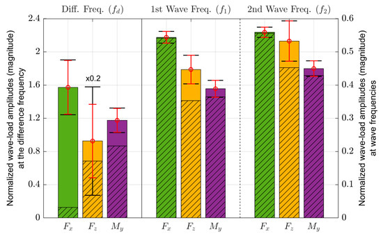 Amplitudes (magnitude) of wave-induced surge force, , heave force, , and pitch moment, , on the floater at the difference () and the two wave frequencies ( and ). The red (narrow) and black (wide) uncertainty bands represent the numerical uncertainty, , and the total uncertainty, , respectively. The hatched areas represent the prediction from potential-flow theory. All quantities associated with the difference-frequency heave force are scaled by a factor of 0.2.