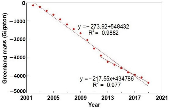 - Bevis, M.; Harig, C.; Khan, S.A.; Brown, A.; Simons, F.J.; Willis, M.; Fettweis, X.; van den Broeke, M.R.; Madsen, F.B.; Kendrick, E.; et al. Accelerating changes in ice mass within Greenland, and the ice sheet’s sensitivity to atmospheric forcing. Proc. Natl. Acad. Sci. USA 2019, 116, 1934. [Google Scholar] [CrossRef]