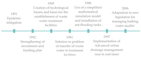 The PDISBA is intended to serve as an effective urban resistance tool that is capable of offering a set of adaptive strategies geared toward reducing the vulnerability of the urban environment and protecting people, assets, and the environment. The Comprehensive Plan for Barcelona’s Sewerage System (PICBA06), drawn up in 2006, is the plan currently in force. However, its projected timespan is not enough to provide answers to the needs posed by society on key issues such as the effects of CC and the social return on investment. Consequently, it was felt that there was a need and justification for updating the plan, with the aim of responding to the new social and environmental reality. Figure 1 shows the different milestones in the drainage master plan for Barcelona.