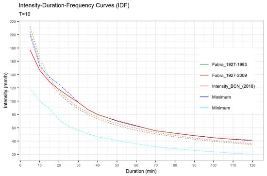 Comparison between the Intensity–Duration–Frequency (IDF) curves used in the previous master plans and the new plan, PDISBA (“Fabra_*”). The maximum and minimum lines were obtained using the different rain gauges across the city. The selected intensity (“Intensity_BCN_2018”) corresponds to the 95% confidence interval.