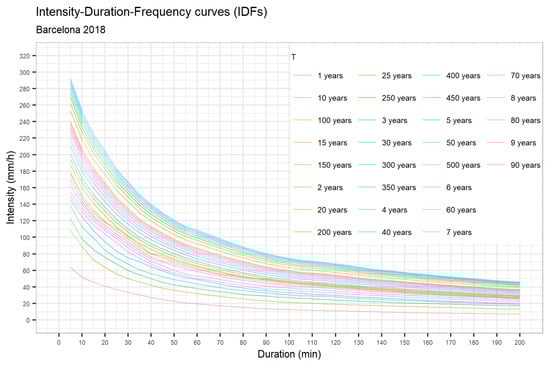 The analysis of extreme rainfall episodes on the pluviometric rainfall series (for the period of 2071–2100) of the most representative pluviometer of the BCASA rain gauge network (the Faculty of Physics Station) allowed to achieve new maximum rainfall intensities and new values of climate change coefficients in the range between 1.07 and 1.26, depending on the frequency and duration of each maximum rainfall intensity (Table 1) [,]. These values represent the 50th percentile of the results obtained by an ensemble strategy considering all of the outputs provided by the 10 general atmospheric circulation models forced by RCPs 4.5 and 8.5 in order to take into account the uncertainty related to model/run selection and the RCP scenario considered. The new range of climate change coefficients achieved in this study is quite similar to the range achieved by Rodriguez et al. [], confirming the same trend of the projections about extreme rainfall events in Barcelona, notwithstanding the use of different general atmospheric circulation models and different climate change scenarios (SRES and RCPs) related to the IV and V reports of ICCP.