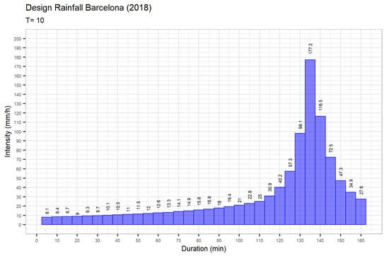 Hyetographs, designed using synthetic rainfall scenarios, were constructed using the alternating block method [] and the S-curves method []. Analysis of the temporal pattern of the rainfall was conducted on a selection of the extreme rainfall events recorded in the last 24 years. According to the study of the temporal distribution of the rain, the average duration varied between 160 and 230 min for the different curves. In the alternating blocks hyetographs, the tails corresponding to the difference between 160 and 230 min were analyzed and finally discarded; therefore, a rainfall duration of 160 min was finally selected. The precipitation duration for the previous plans was approximately 60 min [].