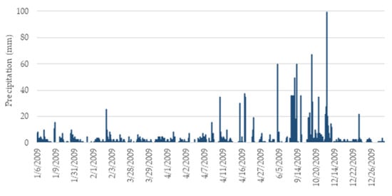As mentioned in the introduction, a continuous modeling of a one-year duration of rainfall is required to evaluate the reduction of CSOs after the implementation of adaptation measures. The typical indicator to evaluate the performance of CSO measures is using the number of events per year []. All of the available time series were analyzed in terms of total precipitation, number of events, and distance between events. The year 2009 was selected as the most representative of the series. The total rainfall was 520 mm and the number of events was 60. Figure 5 shows the data. The plot only includes non-zero values; hence, the horizontal axis is not a continuous time line.