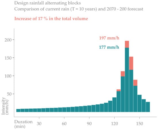 Figure 6 shows a comparison between the design rainfall for a 10-year return period calculated with rainfall data up to 2018 and the forecast for the period 2071–2100 according to the climate change coefficients. The blue is the current rain, while red indicates the future increase in rainfall.