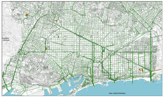Barcelona sewer network introduced to the mathematical model. The green lines indicate the existing pipes. The primary and secondary networks are included.