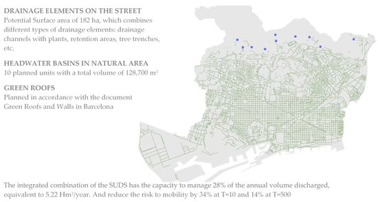 Big cities such as Barcelona have been managing urban flooding risk for at least 50 years. This means that the drainage network has been homogeneously adapted to the regulations and the preferred design criteria; therefore, a small increase in circulating discharge could significantly affect the network’s global performance. Beyond the damage curves, this effect greatly impacts any planned improvements in the network. To properly investigate these impacts, the whole risk management cycle has been reproduced for climate change scenarios in the city of Barcelona. New flood management strategies, such as those related to improving the water quality of receiving water bodies (from the Mediterranean Sea and Bèsos River, in this case), include elements such as sustainable drainage systems (SUDSs) or low-impact development (LID), not present in previous plans, but which modify mitigation budgets in accordance with the hazard.
