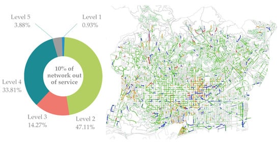 To create this hydraulic model in Barcelona, the data from the sewer network inventoried on a GE SmallWorld GIS platform were imported into Innovyze’s ICM software, which has been used previously in Barcelona [,]. With this aim, a computer architecture was created to automate the transfer of GIS data to hydraulic software, so that periodic updates could be performed relatively easily. In Table 2, a brief summary of the network is provided. More than 85,000 nodes are the basis of the network, including almost 90,000 pipes.