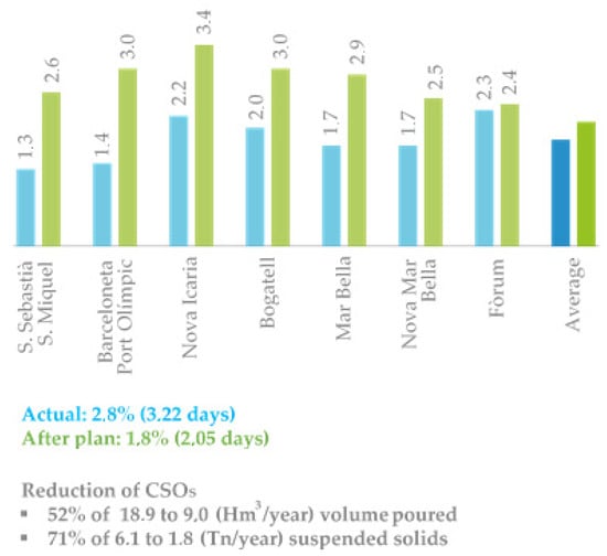 The environmental impact of the urban drainage in Barcelona is mainly provoked by the combined sewer overflows (CSOs) in the sea and in the rivers. In order to properly analyze the effect of the plan’s measures on the CSO, a standard hydrological year was defined as having more than 50 rainfall events.