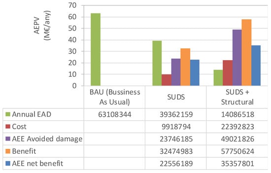 Due to the different time spans and life cycle durations of the infrastructures planned, the equivalent annual annuity (EAA) of the NPV was used to perform the CBA, labeled as the annual equivalent present value (AEPV). The rate of interest used for the financial computation was 1.23% [], and the period considered was 80 years, with an implementation period of 20 years. For the structural measures, the life cycle was assumed to be 80 years, and for the SUDSs, 20 years was assumed. Meanwhile, the green roof life was expected to be 70 years. The benefit was computed using the avoided damage, evaluated as the difference in the EAD [] for the different scenarios.
