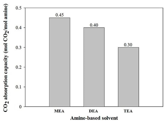 Amines are officially derivatives of ammonia, and where one or more hydrogen atoms have been displaced by an organic substituent, such as an alkyl group, these amines called alkylamines [22]. MEA is one of the most important absorption liquids and is the least expensive. It can be produced in large quantities from ethylene oxide and ammonia reactions. The Acid Dissociation Constant (pKa) is close to a primary amine. Therefore, it has a very good viscosity and an excellent average rate of absorption of CO2, with an over-average normalized ability [19]. An amino group is the perfect group for absorbing CO2 and provides enough alkalinity. It is commonly dissolved so that CO2 chemically reacts with alkanolamines. One of the most crucial advantages of alkanolamines is that, structurally, at least one hydroxyl group is contained in them. Due to this, it can help to raise the solubility in aqueous solutions and mitigate the vapor pressure [10]. Monoethanolamine (MEA) is considered one of the most general alkanolamine groups and is widely used. It has been used for over 75 years to remove CO2 and H2S from natural gas and flue gas [23]. Due to MEA having a high-water solubility, high cyclic capacity, and considerable kinetic rates of absorption-stripping at a low CO2 concentration, it is considered to be a standard sorbent [8].