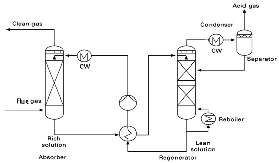 Amine processing includes two major processes of absorption and separation. When the CO2 is absorbed by a lean amine aqueous solution solvent through an absorption process, the equipment used is called an absorber. In addition, the process in which the CO2 is separated from aqueous solution by applying heat is called a separation or regeneration process, and the equipment employed is called a regenerator or stripper [15]. Moreover, the treatment occurs at an absorber at high pressure and at a low temperature, while at the stripper, there is a low pressure and high temperature between 100 and 120 °C [13,16]. There are some arguments about the stripping temperature, which varies between 120 and 150 °C [8,17], 95 and 135 °C [18], and 120 and 140 °C [15]. Therefore, the system includes heat, a cooling source, and a compressor to raise the pressure of flue gas before it enters the absorber. Furthermore, the system includes a pump to circulate the lean solution and rich amine [13,15,16]. In absorption, the following steps occur [19]: