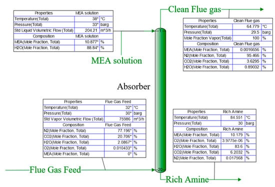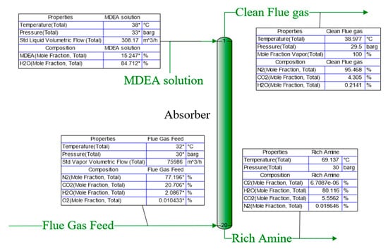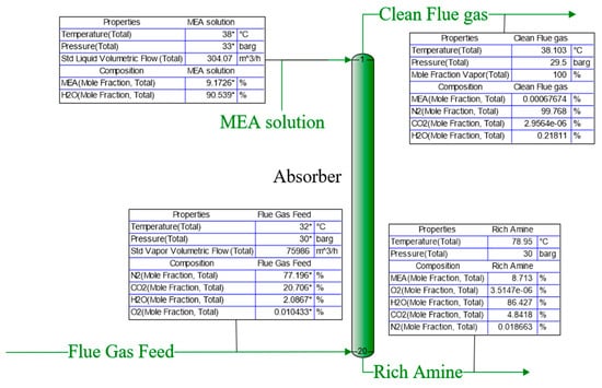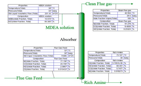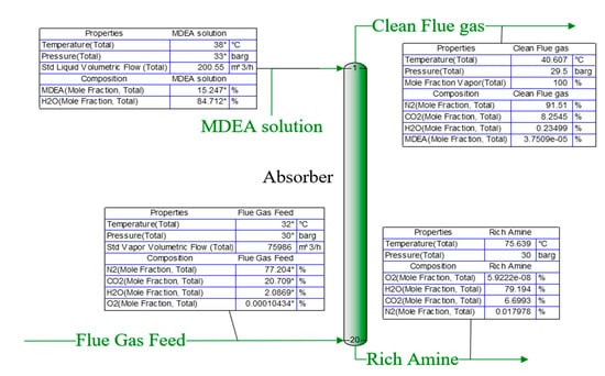The purified gas emitted out into the atmosphere is washed by water at the top of the absorber to cool the top of the tower, prevent evaporation of the amine solution, and mitigate the loss of solvent [9,13,15,17]. Furthermore, the loading is varied from 0.1 to 0.45 mol CO2/mol amine, depending on the lean and rich solvent (generally, lean and rich solvent CO2 loading of 0.1-0.2 mol CO2/mol MEA and 0.4–0.5 mol CO2/mol MEA, respectively) and on several other factors, which are