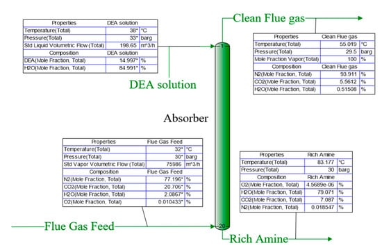 DEA is an inexpensive solvent due to its wide use in many industries, and it is especially used for removing CO2 and H2S in natural gas that has rapidly reacted, where the selectively is high (between other and acid gases), and for the reversible reaction process at the absorber column. Furthermore, the operation conditions can be a low heat reaction (around 70 kJ/mol CO2) and low pressure [30]. One of the most common disadvantages is the presence of SO2 and O2 in flue gas, causing solvent degradation (which should be less than 10 ppm). The presence of O2 in flue gas causes the oxidation of DEA and leads to increased degradation [10]. The concentration of diethanolamine varies, depending on the amount of CO2 to absorb. In approved industries, the concentration has been shown to be between 25 and 35% and lean amine (DEA) loading is set at 0.1 mol CO2/mol DEA [30], whereas the rich amine of diethanolamine loading is 0.4 mol CO2/mol DEA, as illustrated in Figure 4 [5].