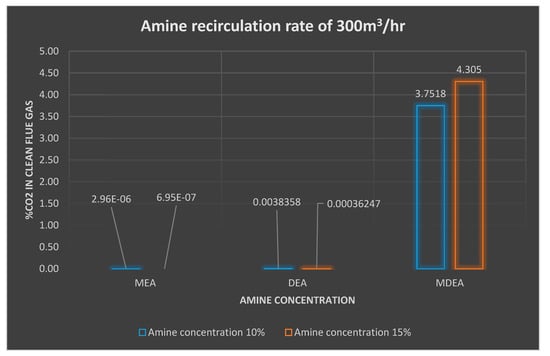 The Amine Sweetening Peng Robinson (PR) was employed as the most compatible thermodynamic equation to handle the components listed in Table 7, when combined with Amine absorbent. The process was then followed by specifying the components in the Flue gas, followed by column convergence using MEA. This was then repeated at 300 m3/h as well as changing the absorbent type. The procedure shown in Figure 6, was used to simulate amine solvents MEA, DEA, and MDEA, in order to capture the carbon dioxide from flue gas, utilizing amine concentrations of 10% and 15% for all solvents and circulation rates of 200 and 300 m3/h. In addition, the flue gas flow rate, compositions, temperature, and pressure of the flue gas and amine solvents was kept constant through all scenarios, having 20 trays and a 0.5 pressure drop from the bottom to top column.