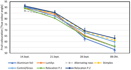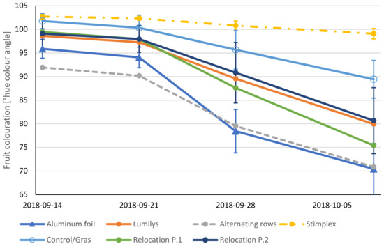 Hue colour angle of the bottom side of apples below 1 m height exposed to aluminium foil (triangle), LumilysR reflective (plastic) mulch, LumilysR in alternating tree rows (closed circles), the biostimulant StimplexR, control/grass (open circle) and relocation P.1 and P.2 for the four measurement dates (n = 10/per treatment and measurement day plus SEs at the 5% error level for StimplexTM control, relocation P2 and P1 and aluminium foil).