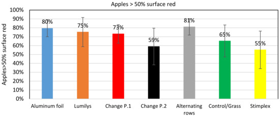 Effect of colour enhancing measures on the portion of apples with more than 50% red colour on their surface, with SDs at the 5% error level from machine sorting results (n = 6900).