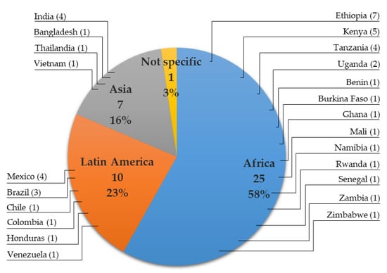 The papers selected refer to projects implemented in 23 different countries, distributed among three continents. The geographical distribution is described in Figure 1 and shows that most papers are set in Africa. This could be a random result or could indicate that participatory approaches are more frequently used in African projects.