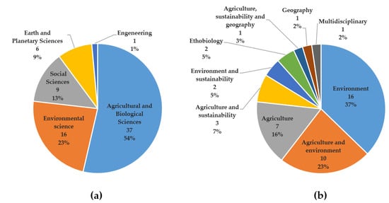 Finally, the composition of the research groups was examined, using the indication given by Scopus about every author’s main subject area (Figure 2a). This information can be found opening the author sheet and selecting the voice “show all authors info” under the title “Subject areas”. Most papers (19) were written by research groups of joint agricultural and biological sciences experts. They collaborated with environmental experts in 6 papers. Papers written by environmental experts only (5) were published on environment, sustainability and geography journals. Earth and planetary science experts worked together with environmental, agricultural and biological sciences experts and published on environmental journals. The only group featuring an engineer was composed of agricultural and biological sciences experts and published on a multidisciplinary journal [13]. Only 9 papers were written in collaboration with social sciences experts [14,15,16,17,18,19,20,21,22], who worked in multidisciplinary teams (6), or only with agricultural and biological sciences experts (3) and published in all types of journals.