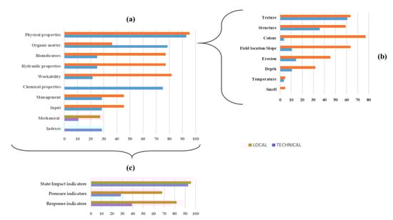 It is possible to observe (Figure 3a) that indicators related to physical properties are the most widely used in both local and technical knowledge.