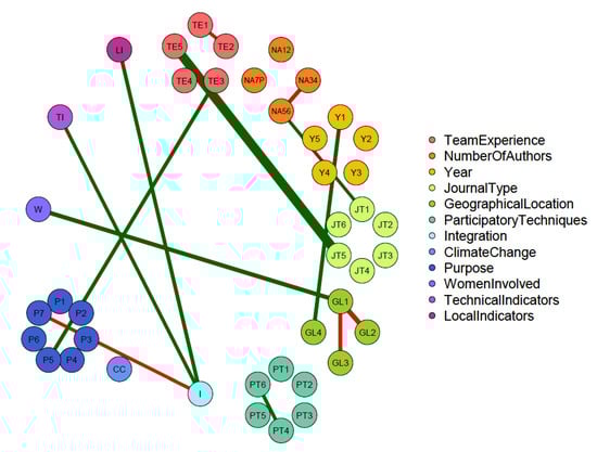 We tried to summarize this analysis by asking ourselves: are there relationships among papers based on their characteristics? Which indicators are preferred to analyze certain problems? Are some participatory techniques more efficient to select some types of indicators? Are there some participatory techniques or indicators’ categories that are more useful for certain purposes? To answer these questions, a quantitative meta-analysis has been carried out, calculating relationships among different characteristics of the papers, using the qgraph instrument with R software (Figure 4).