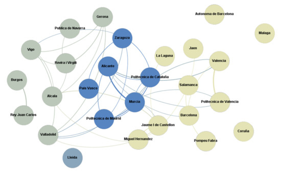 Gephi analysis has been used to investigate to what extent there are common patterns for the SDGs and their driving factors in Spanish public universities. Figure 1 shows the results of the Gephi analysis of the significant factors that influence the contribution of universities to the SDGs (WP, IntR and CapTransfers) with a modularity of 0.230, in which three communities can be identified (All universities are related to each other, but only 11% of the closest relations (small distances among them) are shown, for clarity).