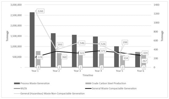 Per annum, an approximate amount of 314 tons of iron and steel general compactable waste was generated in the case study that primarily demonstrates similar composition to general municipal waste. Table 4 illustrates the leading waste management system components, including crude steel production, for analyzing this section. The amount of iron and steel waste generated per ton of crude carbon steel as 2.15 tons, was higher than the world steel average of 0.3 tons per one ton of crude carbon steel and was principally related to inefficient iron and steel waste disposal and re-use practices, process inefficiencies, challenges experienced in the waste management and operational systems and aging manufacturing infrastructure.