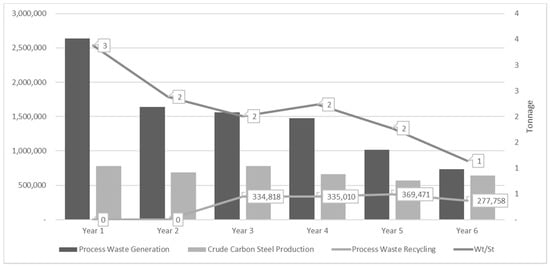 The horizontal performance analysis—iron and steel waste efficiency for process waste at the case study over six years.