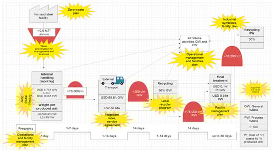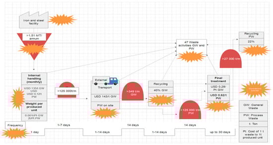 Step one and two of the VSM data input and analysis were used to compile the actual state map (Figure 3). Activities associated with sub-process performance were included on the map to display waste flow and industrial waste generation costs visually. An immediate opportunity could be identified by generating an actual state map to reduce waste generation and costs associated with waste activities. After the first year of applying the VSM method, industrial waste was reduced by 28%, and costs associated with industrial waste removal was reduced by 45%. Externalizing the iron and steel facility’s waste operations was found to be cost-intensive. By utilizing existing personnel, waste costs could be reduced within a year with the added advantage of having full control over the flow and management of waste. Visualizing and analyzing key waste streams, recycling status, waste flows, and investigating waste generation areas helped identify double handling areas with unnecessary associated costs. Other immediate areas of improvement included using waste infrastructure strategically to minimize waste mixing and optimize waste transport logistics.