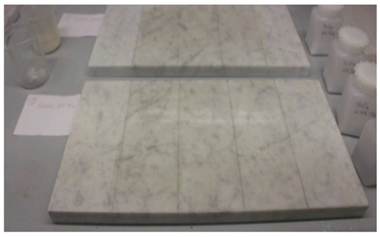 Aeroxide TiO2 P25 consists of particles having mean diameter of approximately 21 nm with a high photoactivity. In the presented experiment, Nano Estel and TEOS were diluted to 3% with deionized water and, after that, mixed with different weight percentage concentrations of TiO2 (from 0 to 8 wt%). These coatings, with increasing concentrations of nanoproducts, were applied on marble (Figure 1) and travertine samples.