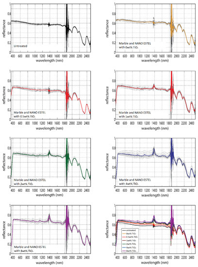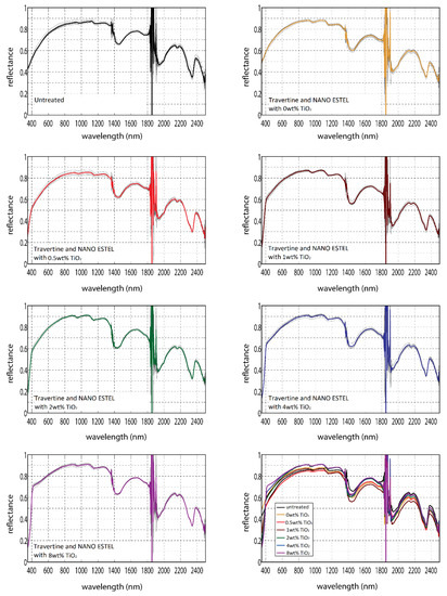 Spectral signatures obtained by spectroradiometric survey of the surface of travertine samples prepared in laboratory with Nano Estel coatings blended with different weight percentage concentrations of titanium dioxide (TiO2). In each graph, the gray curves represent the spectral data for different measurement areas on the same sample, each of which is the average calculated over 25 measurements on the same area during the acquisition phase, whereas the colored curve is the mean spectral signature. The overlap of the different signatures (bottom right graph) shows the effect due to the increasing wt% of TiO2.