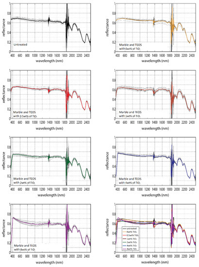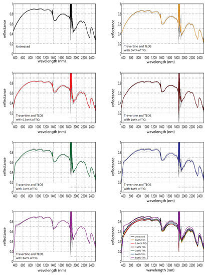 Spectral signatures obtained by spectroradiometric survey of the surface of travertine samples prepared in laboratory with TEOS coatings blended with different weight percentage concentrations of titanium dioxide (TiO2). In each graph, the gray curves represent the spectral data for different measurement areas on the same sample, each of which is the average calculated over 25 measurements on the same area during the acquisition phase, whereas the colored curve is the mean spectral signature. The overlap of the different signatures (bottom right graph) shows the effect due to the increasing wt% of TiO2.
