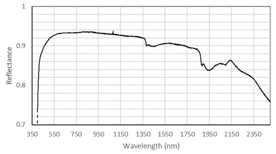 Measurements of solar reflected radiance were carried out with FieldSpec pro portable spectroradiometer (ASD Inc., Longmont, CO, USA) [26]. The instrumentation was equipped with three different spectrometers covering the 350–2500 nm spectral range: the first detector worked in the VNIR range (350–1000 nm), and the other two in the SWIR region (1001–1800 and 1801–2500 nm, respectively). These sensors are characterized by spectral resolution of 3 nm at 700 nm and 10 nm at 1400–2100 nm; spectral sampling of 1.4 and 1.1 nm in the ranges 350–1000 nm and 1001–2500 nm, respectively; and wavelength accuracy 0.5 nm. All details about the technical specifications of the instrumentation are available in [26].