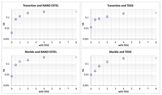 The similarities have been calculated in terms of SA for each material and each coating (Figure 7). The graphs in the figure show the trends as a function of the TiO2 weight: the values increase significantly up to 4 wt%; the difference, on the other hand, is practically negligible when comparing those with 4 and 8 wt%. Therefore, the correlations are able to indicate the amount of TiO2 when it is less than 4 wt%, while they do not allow discrimination of larger quantities with reliability.