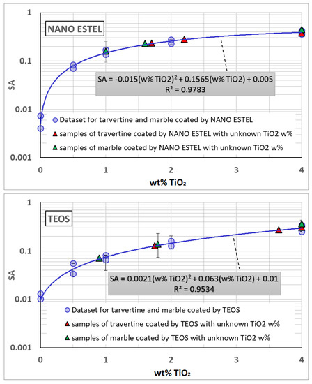 Moreover, the SA values obtained for the different stone materials with the same coating appear comparable; therefore, only a relationship was calculated for each coating material (cf. Figure 8). In addition, some blind tests were performed to evaluate the capability to detect the unknown weight percentage concentrations of TiO2 wt%. In particular, the correlations were used to evaluate the weight percentage concentration of TiO2 of 12 samples: 6 of marble (cf. green triangles in Figure 8) and 6 of travertine (cf. red triangles in Figure 8). The concentrations determined by means of spectroradiometric measurements, after the application of the coating materials by brushing on the stones, were compared to those of the coating production provided by the laboratory (Table 1): the differences seem almost always contained; in fact, the absolute values are equal to or less than 0.5. Only one of the tests showed a significant deviation. It is worth pointing out that the differences can be related not only to the error introduced by correlations, but also due to the actual concentration of TiO2 in the coating placed on the stone following the application method.