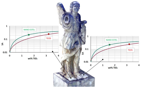 Applications of TiO2-coatings Nano Estel and TEOS on small parts of the “Angelo Tutelare” statue located in the coastal urban environment of Reggio Calabria city. The 3D reconstruction of the statue was performed by terrestrial laser scanning. The graphs show the values of TiO2 wt% in the coatings obtained through the correlations of Figure 8.